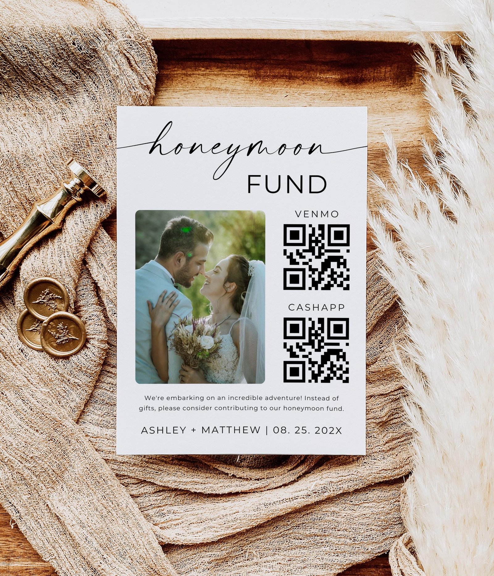 Make your big day even more memorable with a modern twist on gift-giving. The Honeymoon Fund Wedding Sign QR Code allows guests to easily donate to your honeymoon fund by scanning a custom QR code that links directly to your Venmo, PayPal, or preferred payment platform.