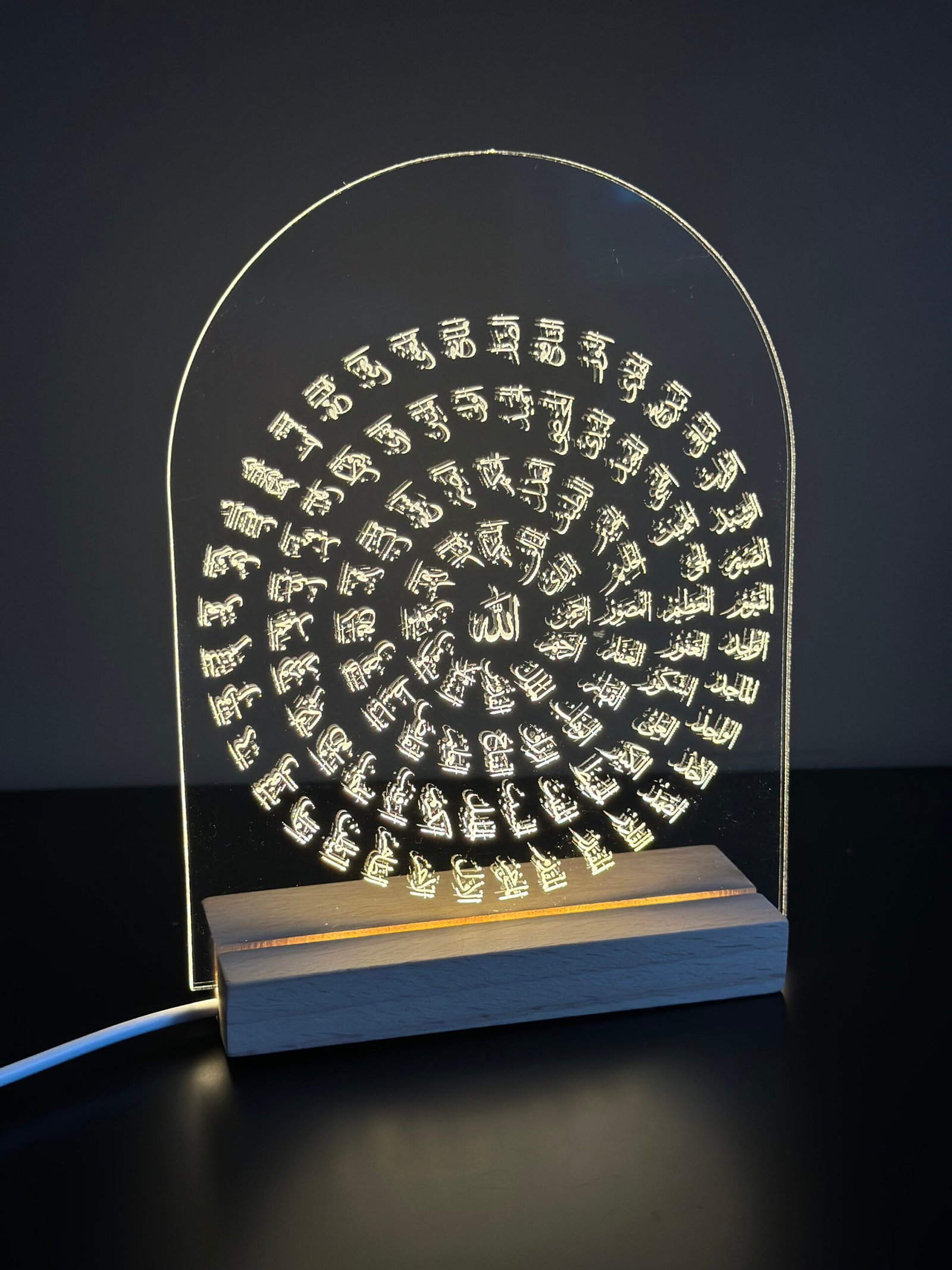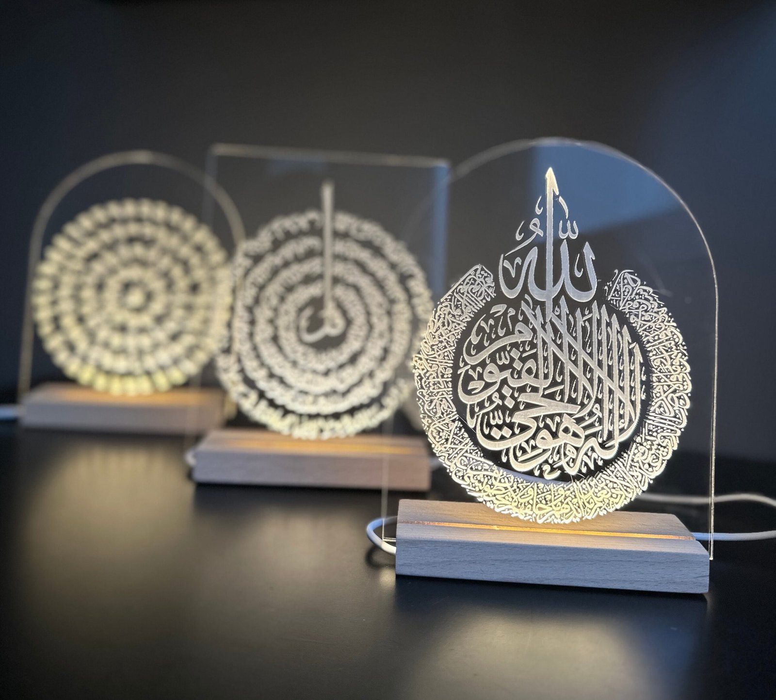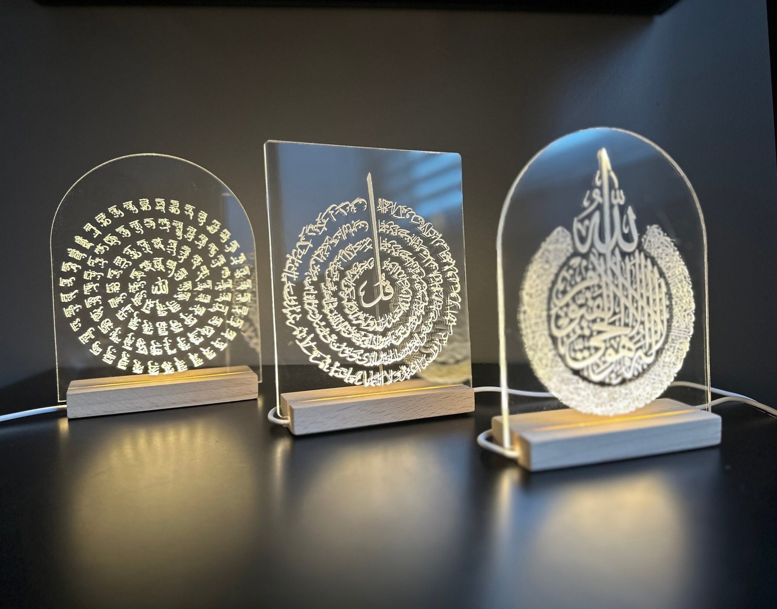 Have the most powerful verse in the Quran, the 4 Quls, and 99 Names of Allah on display with this graceful light-up plaque. Engraved on high-quality acrylic to add a 3D effect, this beautiful piece combines spiritual significance with modern aesthetics. It adds a unique and elegant touch to your home.