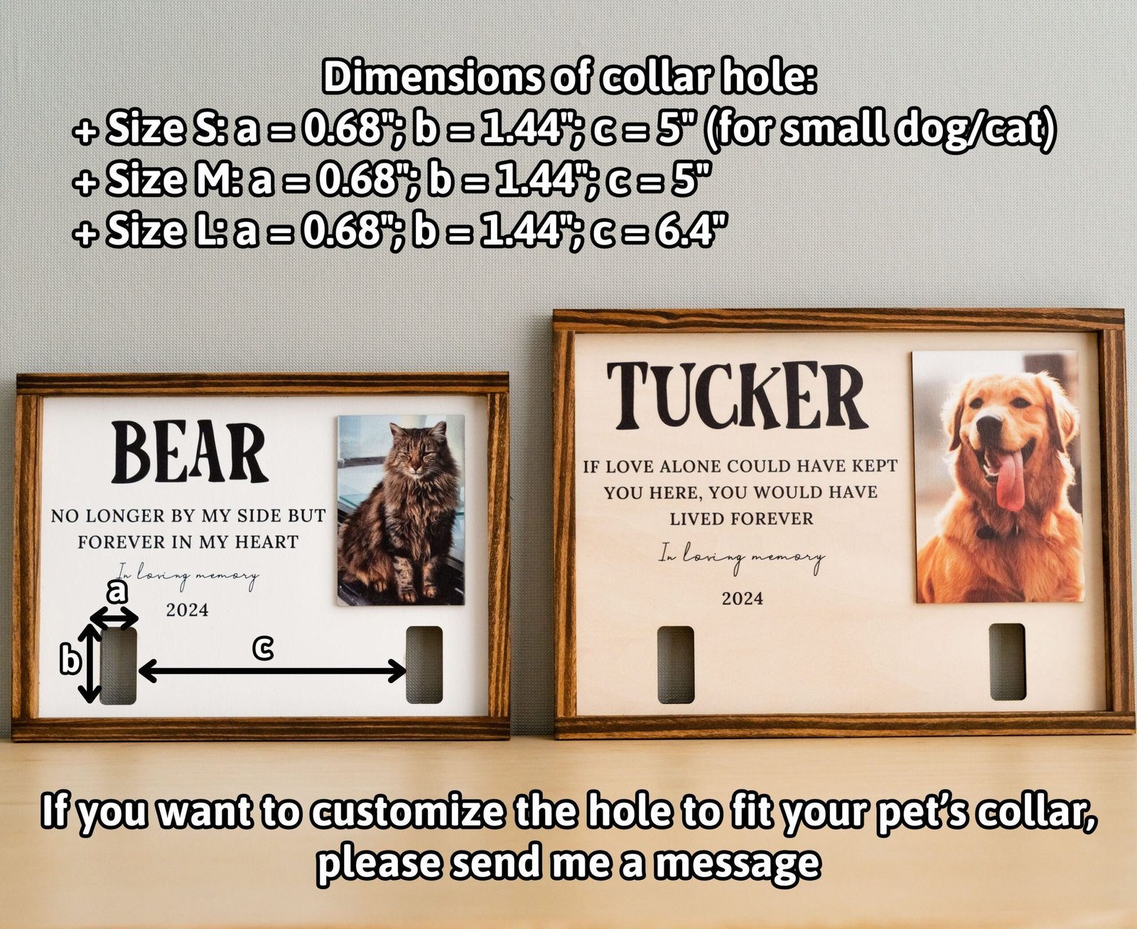 “Beautiful craftsmanship. The wood is sturdy, and the design is simple but perfect. The collar fits easily, and the photo makes it even more personal.” – Natalie M.