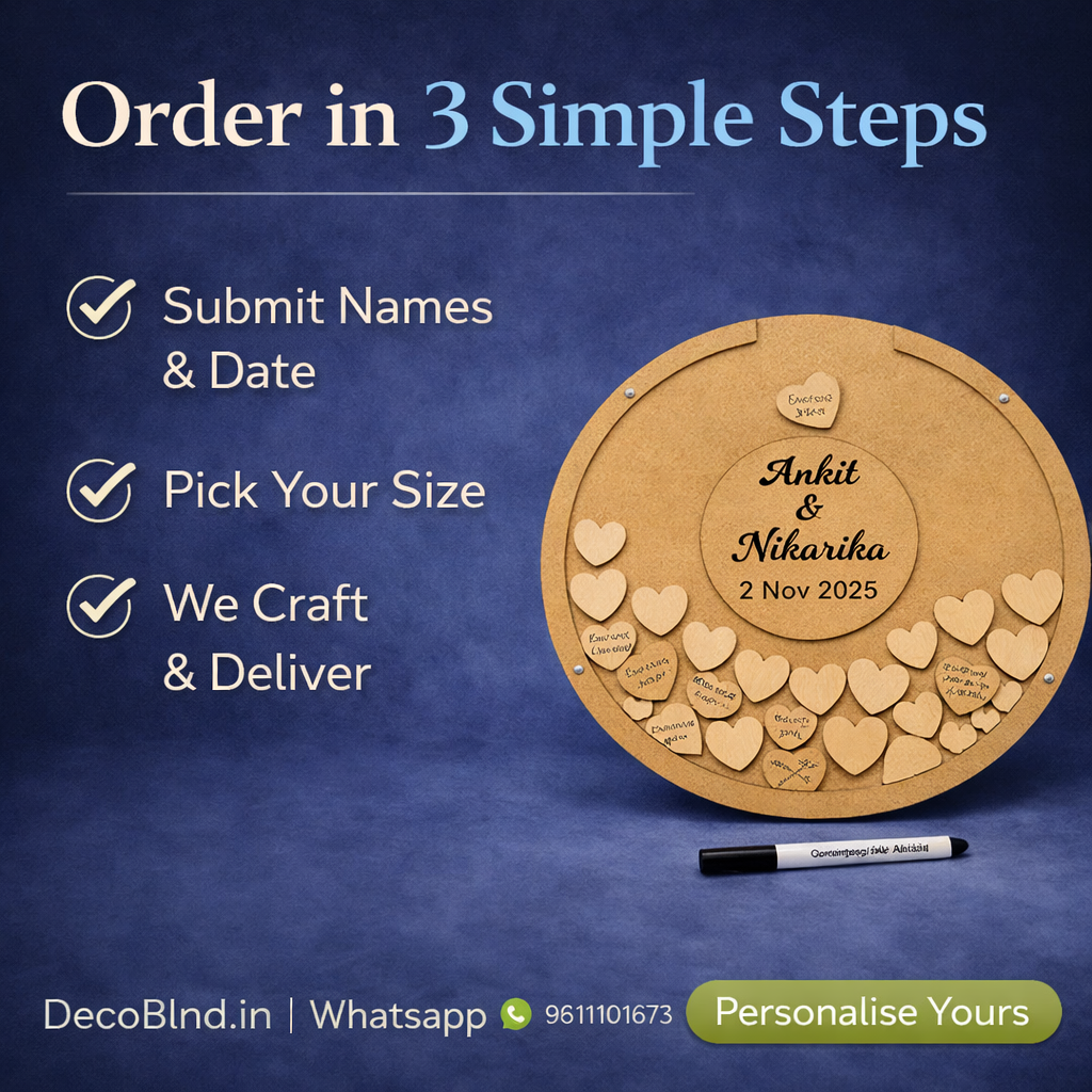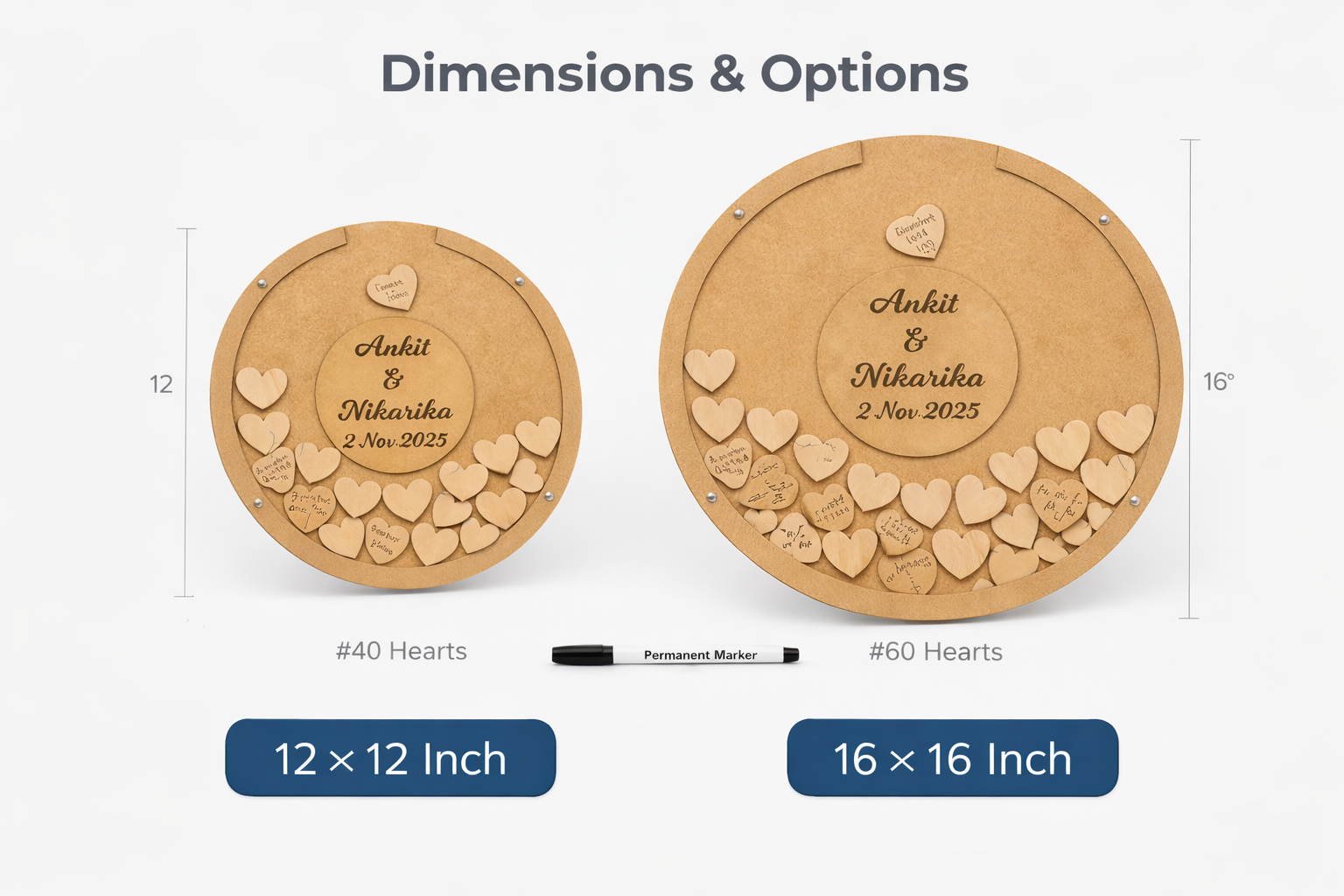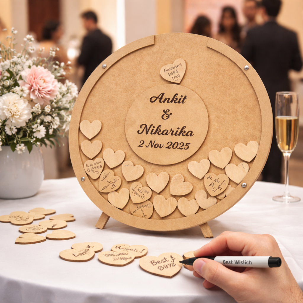 Each guest writes a message on a wooden heart, which is then placed into the frame — transforming love, wishes, and emotions into a display you can treasure for years.