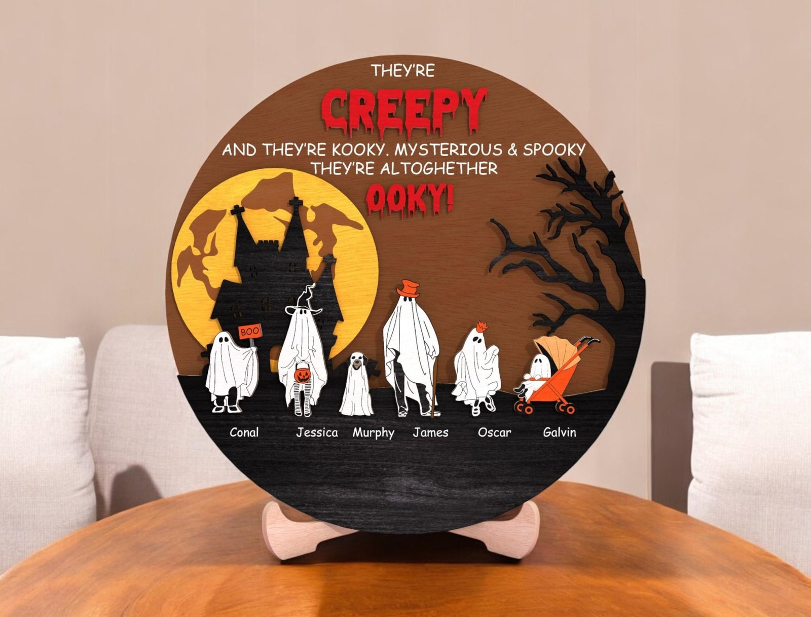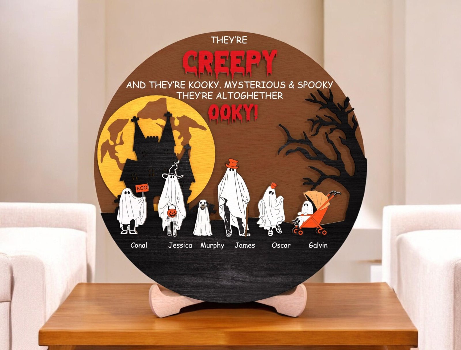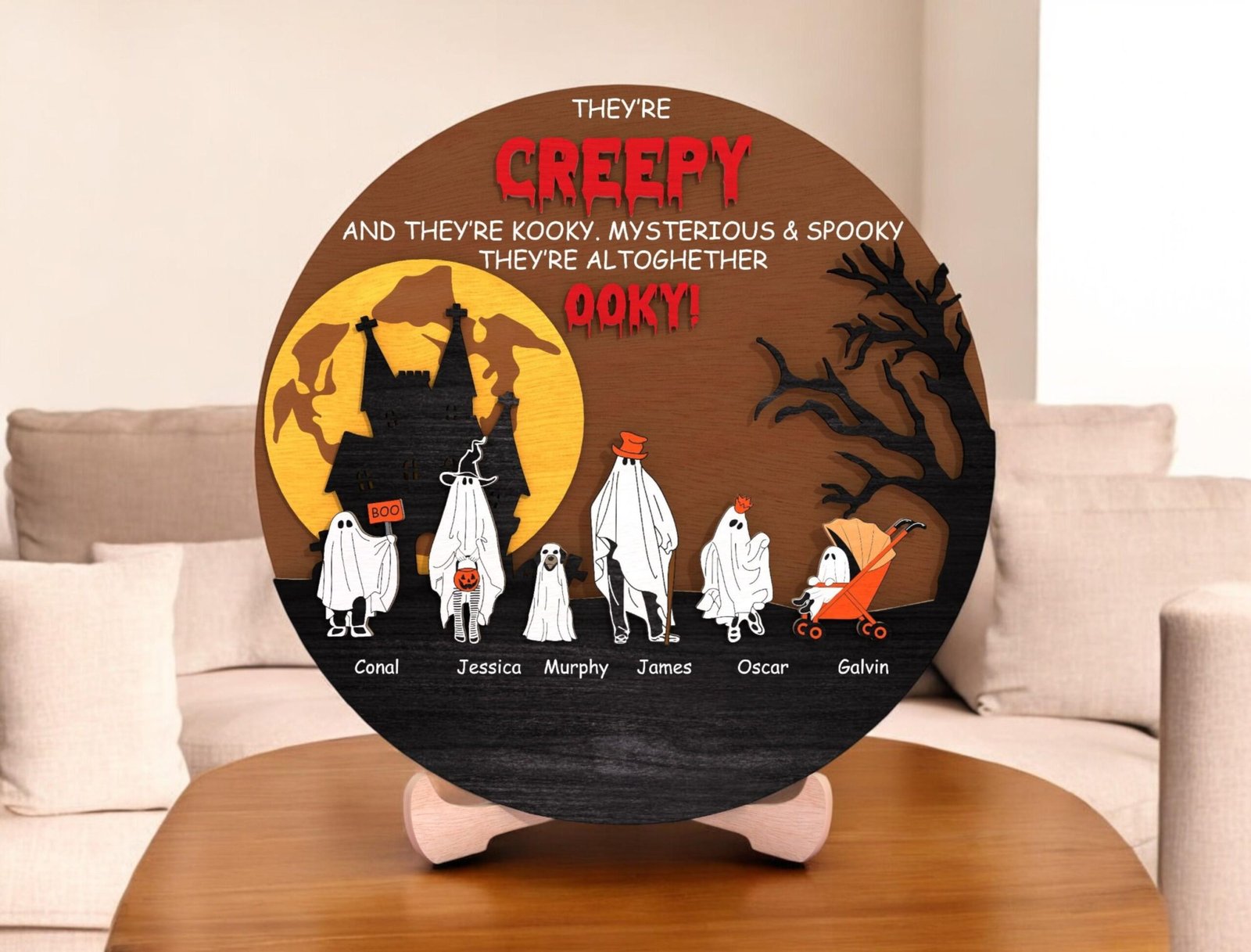🕸️ Add some spooky charm to your Halloween decor with this personalized ghost family sign! This round wooden plaque features a haunted castle, full moon backdrop, spooky tree silhouette, and an adorable line of ghost family members — each labeled with a custom name. The bold quote “They’re creepy and they’re kooky, mysterious & spooky…” adds a fun touch inspired by classic Halloween vibes! Perfect as a seasonal decoration or a one-of-a-kind gift for Halloween-loving families, this piece brings warmth and whimsy to your home or entryway.